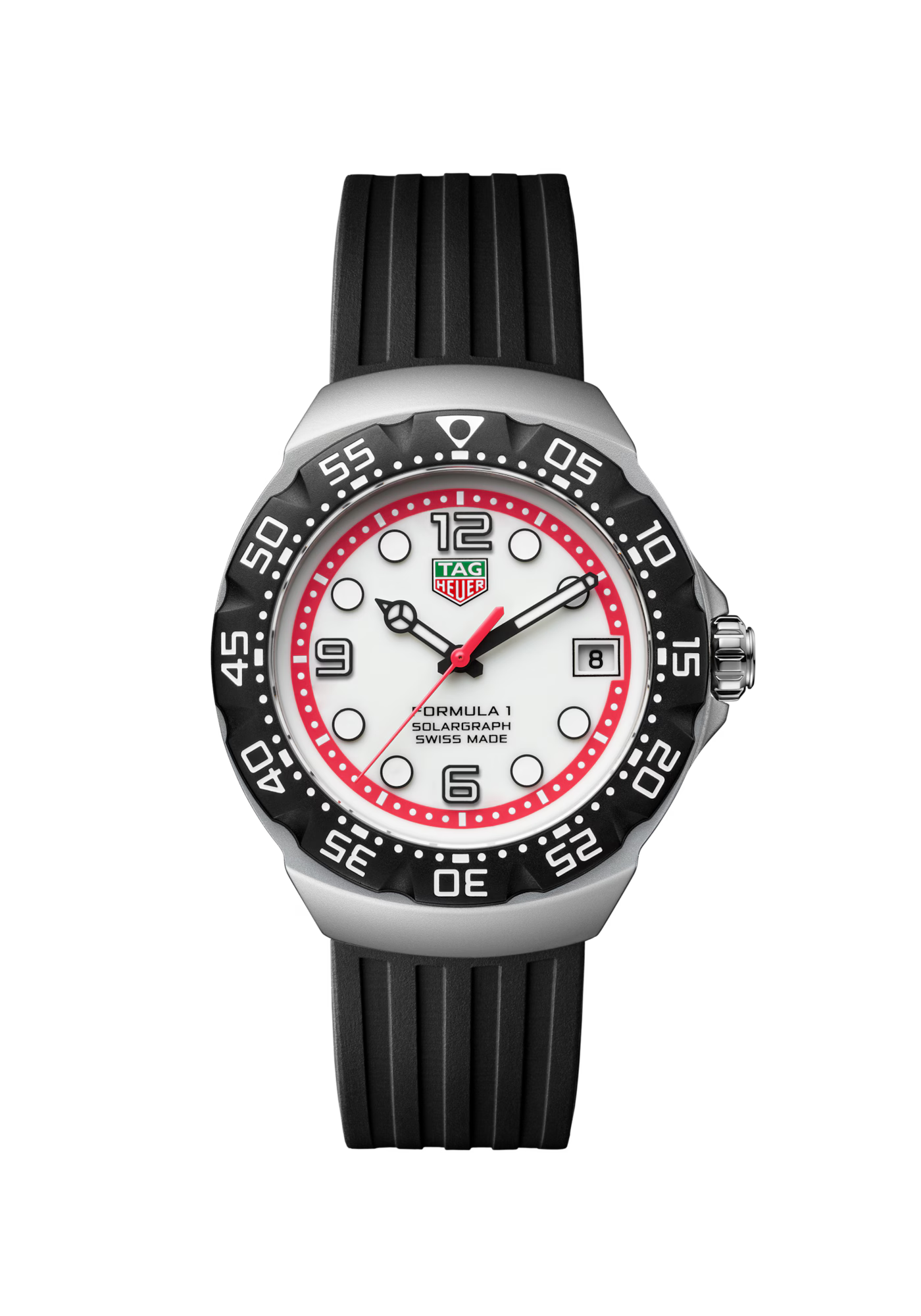 A confident addition to the Formula 1 collection, this TAG Heuer Formula 1 Solargraph (38mm) features a white opalin dial framed by a black TH-Polylight bezel and a striking red flange. Robust, ergonomic and ready for daily wear.